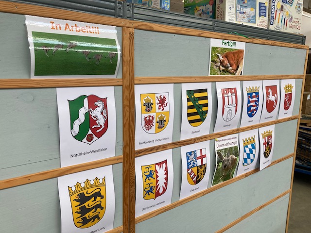 Heute haben wir die letzten Pakete für die Schulen in Rheinland-Pfalz gepackt und das entsprechende Schild wanderte auf unserer Motivationstafel nach rechts. In die Mitte hat sich zu Baden-Württemberg nun Nordrhein-Westfalen gesellt, was uns diese Woche und auch nächste Woche noch beschäftigen wird - 2800 Schulen sind eine stattliche Anzahl, die da auf uns wartet! Vermutlich werden wir morgen Baden-Württemberg abschließen und dann auf beiden Packtischen die Pakete für NRW packen.